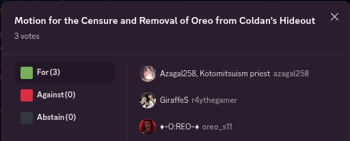 That the Grand Council formally recognizes the declaration of Kaede as main bias as an act incompatible with the office of President of Coldan’s Hideout;